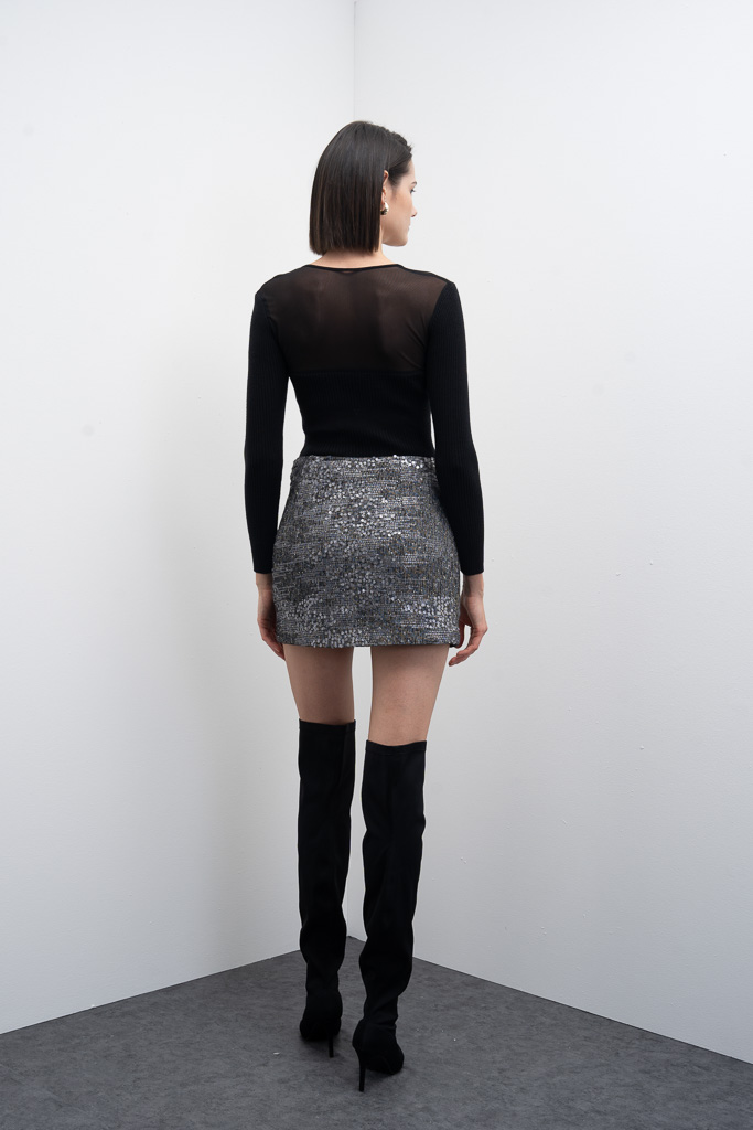 Suéter de punto ajustado con detalles de tul. Escote redondo y parte superior transparente. Mangas largas y ajustadas. Busto tipo corsé. Tejido elástico y cómodo. Estilo sofisticado y elegante. La modelo mide 1,78 m y usa una talla S.