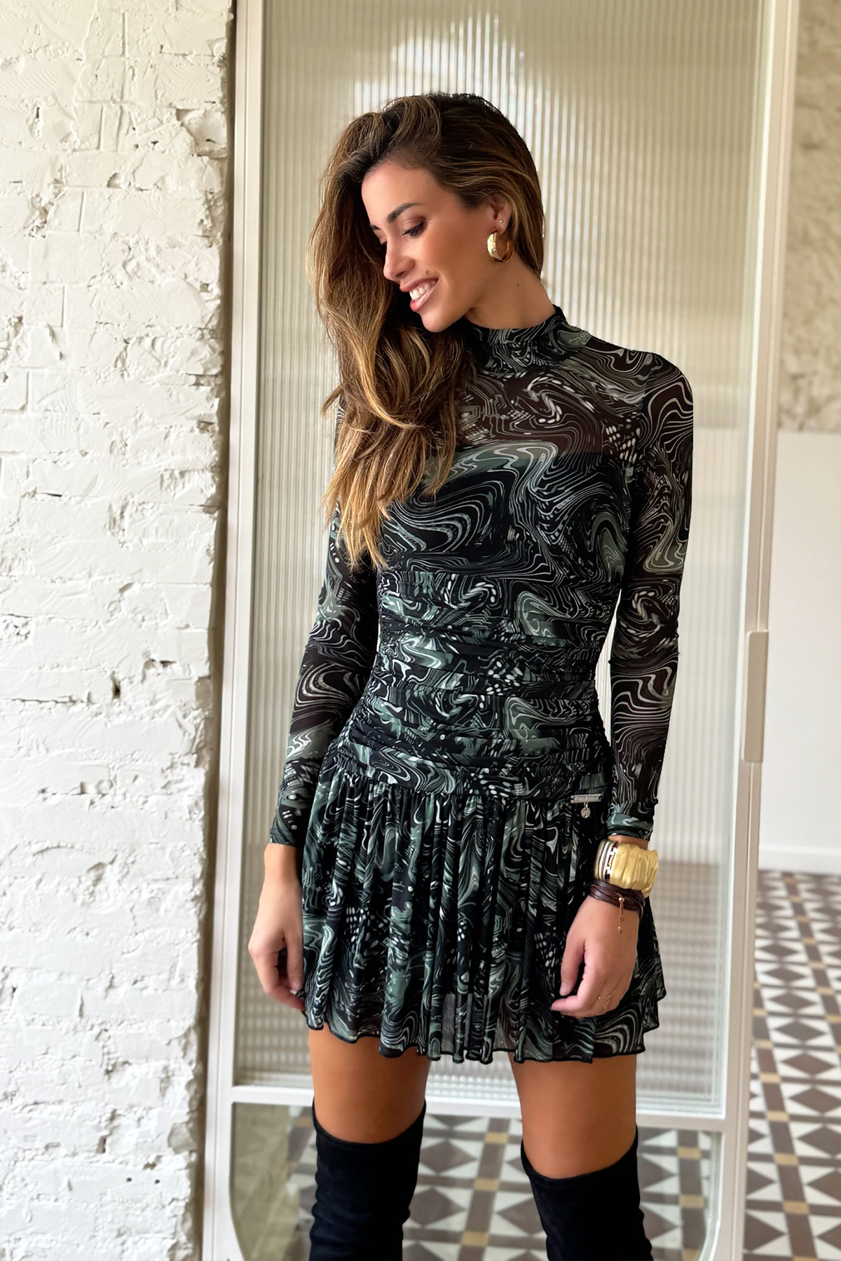 Vestido corto, en color negro y verde, con estampado marmolado. El tejido es de tul y es entallado hasta la cadera, de la que sale un falda con vuelo. El cuello es halter y se cierra con cremallera invisible.