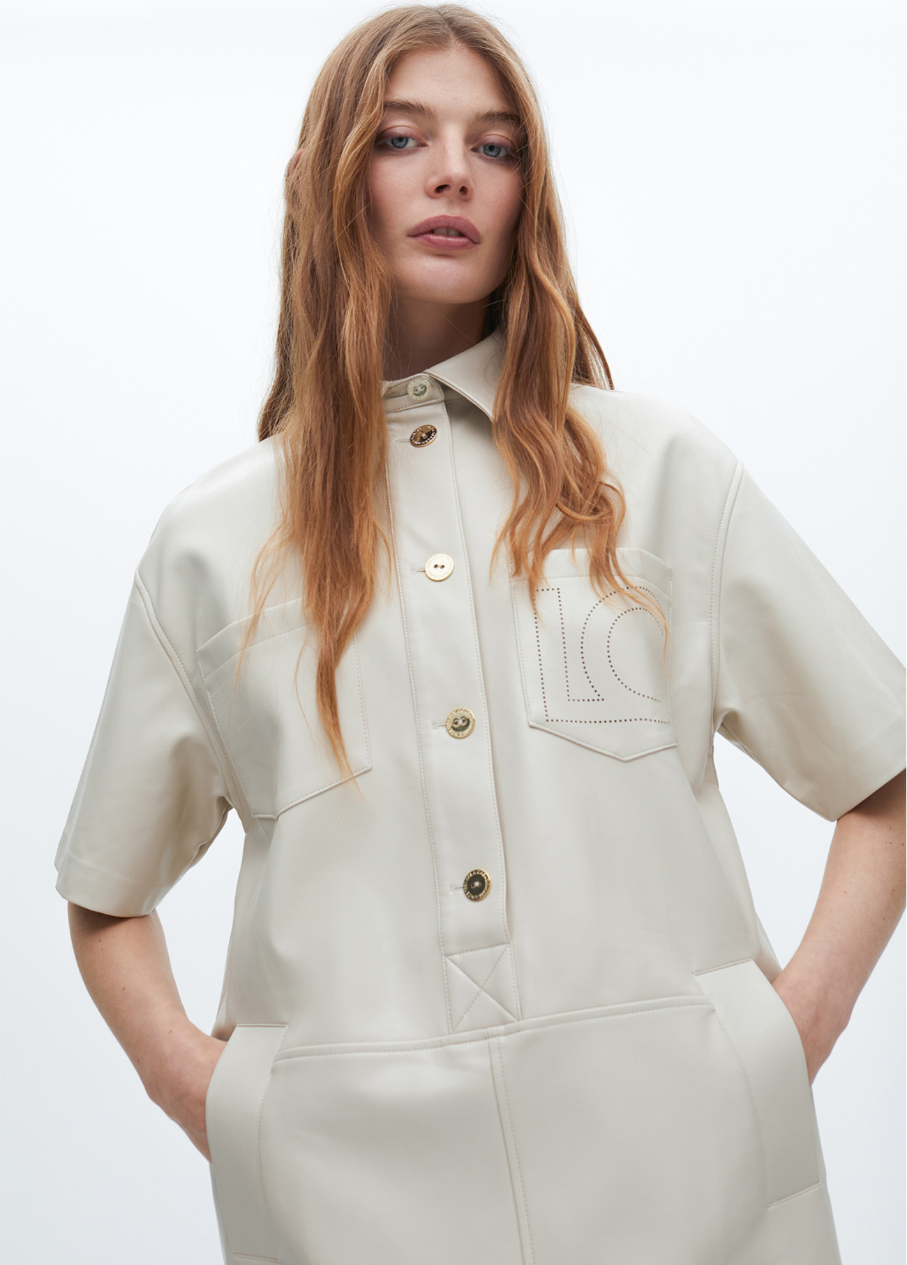 Vestido mini en efecto piel con diseño recto. Botonadura central y cuello clásico. Detalle de bolsillos laterales discretos. Logotipo de la marca en el pecho. Ideal para un toque moderno y sofisticado.