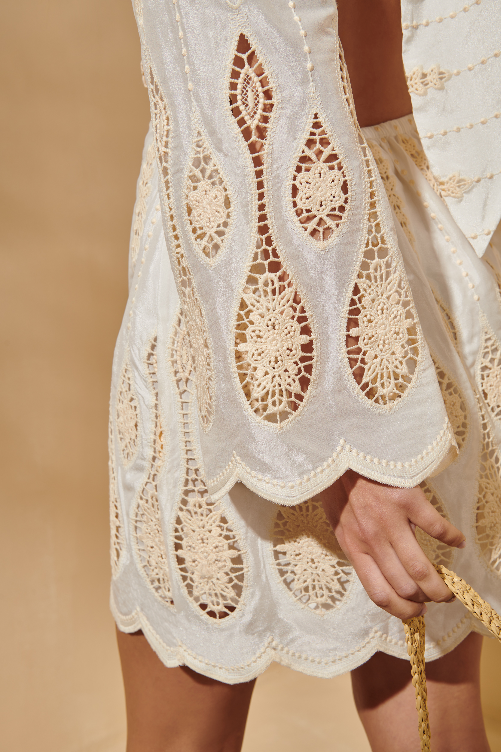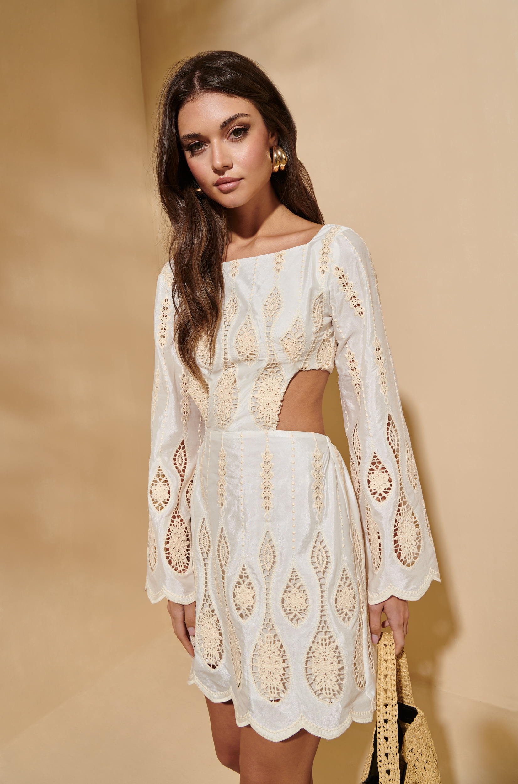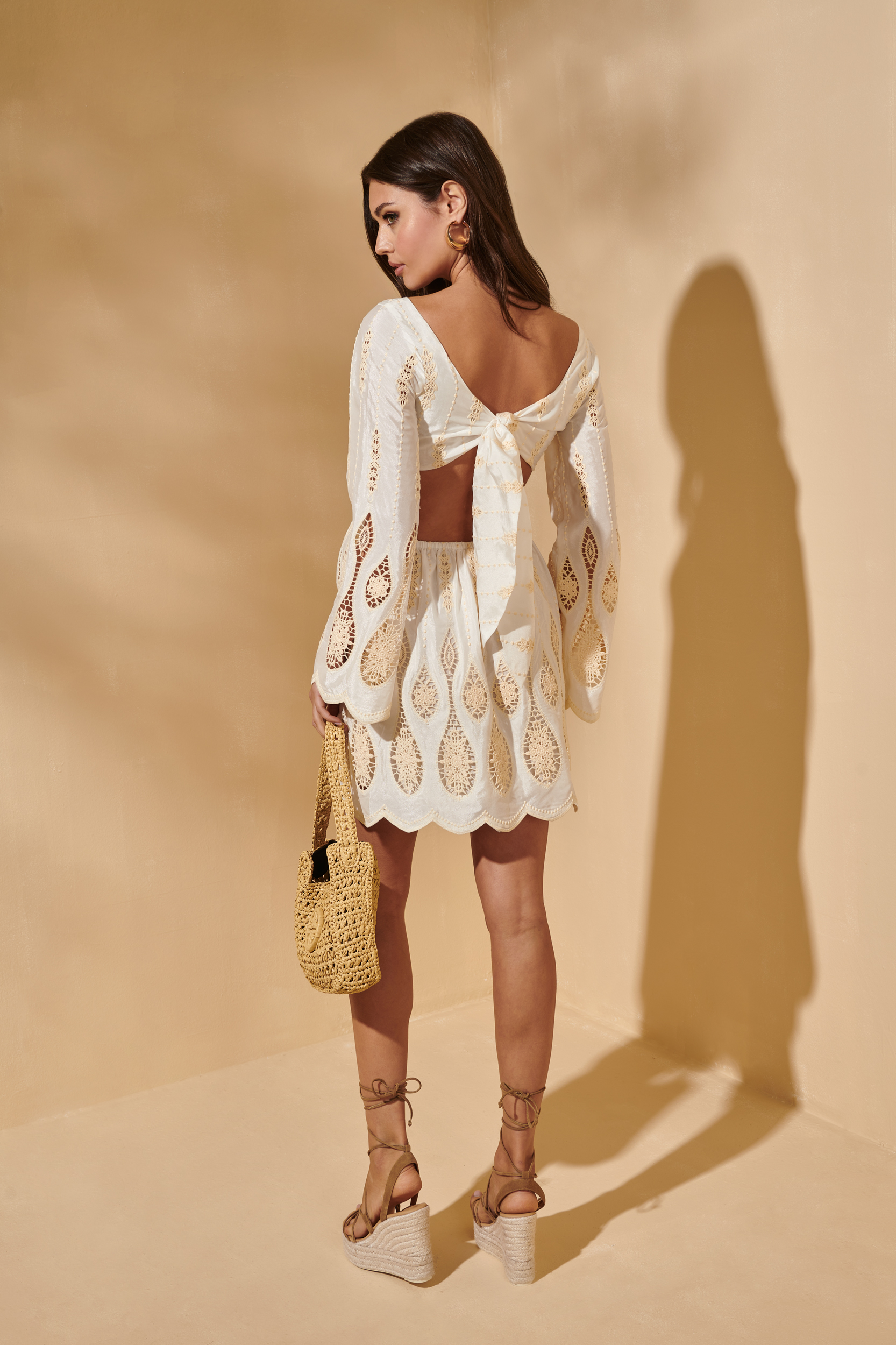 El Bohemian Sunrise Dress White es una joya de inspiración bohemia con un aire fresco, delicado y sofisticado. Su diseño en color blanco incluye bordados geométricos troquelados, mangas largas acampanadas, y una abertura lateral y trasera que aporta sensualidad sin perder elegancia.