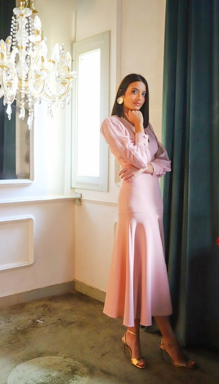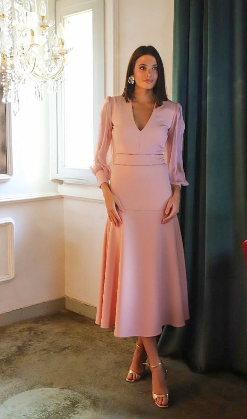 Vestido perfecto para invitada a comunión. Confeccionado en tejido bioelástico combinado con gasa. Detalle de botones forrados en puño y vivo de raso en cintura. Cremallera invisible en espalda.