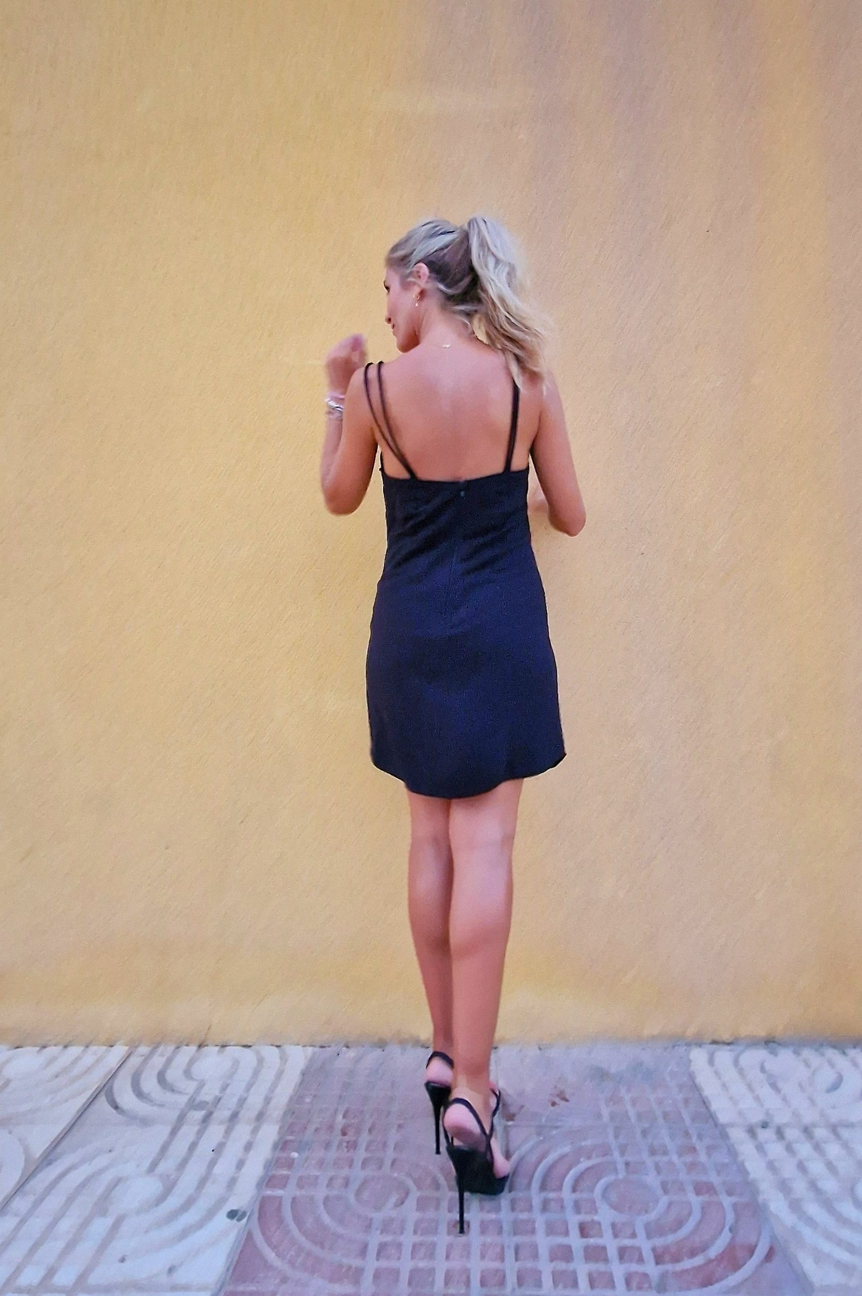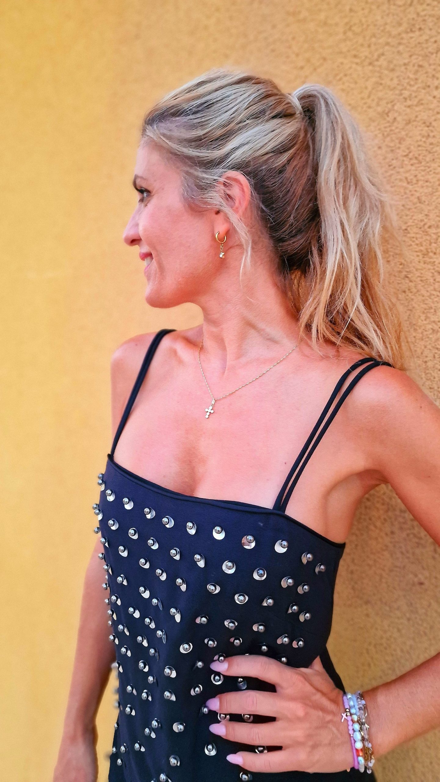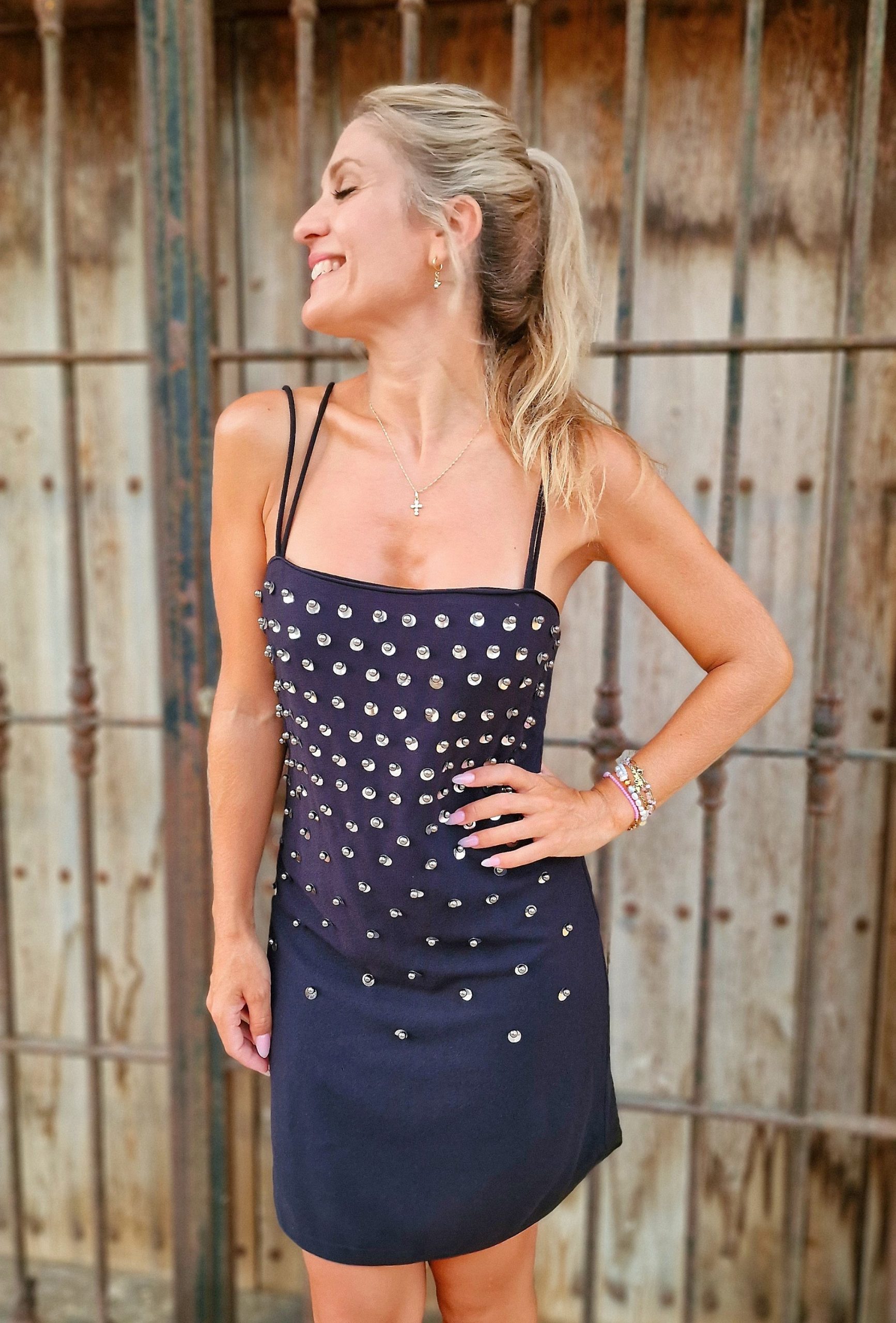 Viscosa, forrado, apliques en tonos plateados, cierre con cremallera trasera.