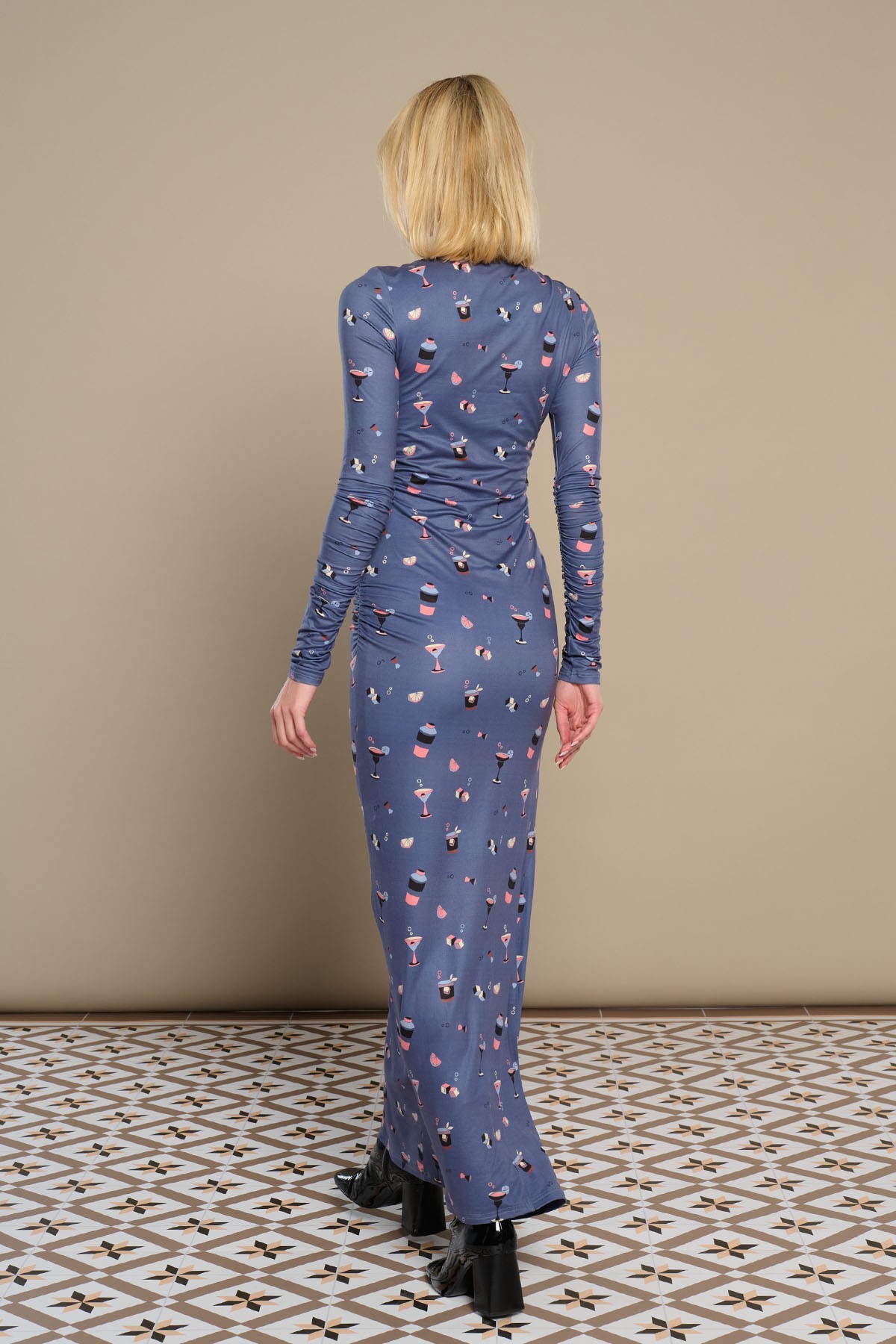 Blusa de chiffon son cuello caja y manga larga. Detalle de volantes en cintura y puños. Forro interior.
