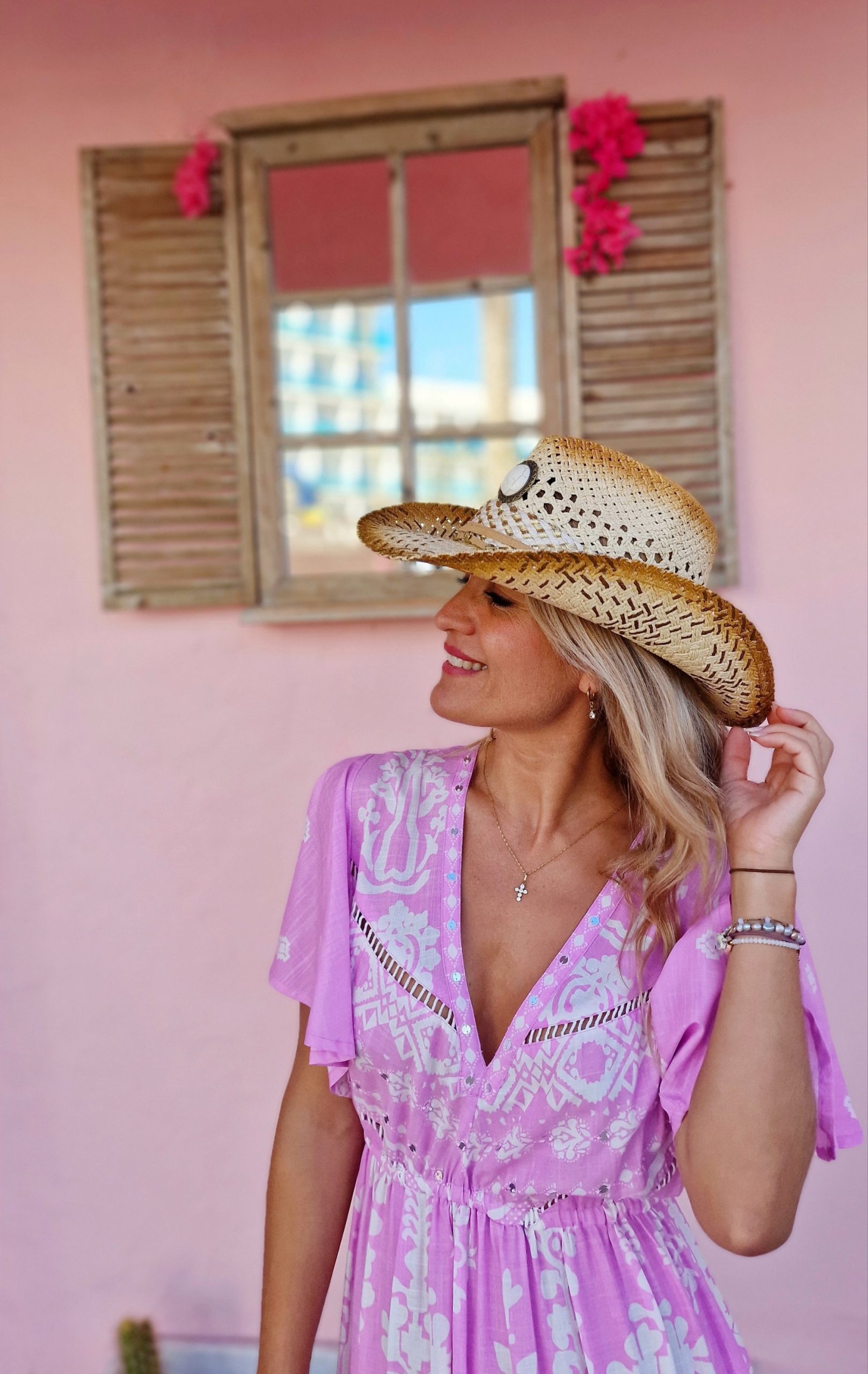 El vestido largo «Grecia Rosa» con mangas cortas ofrece un diseño elegante en un tono rosa sofisticado. Ideal para eventos formales o cenas especiales.