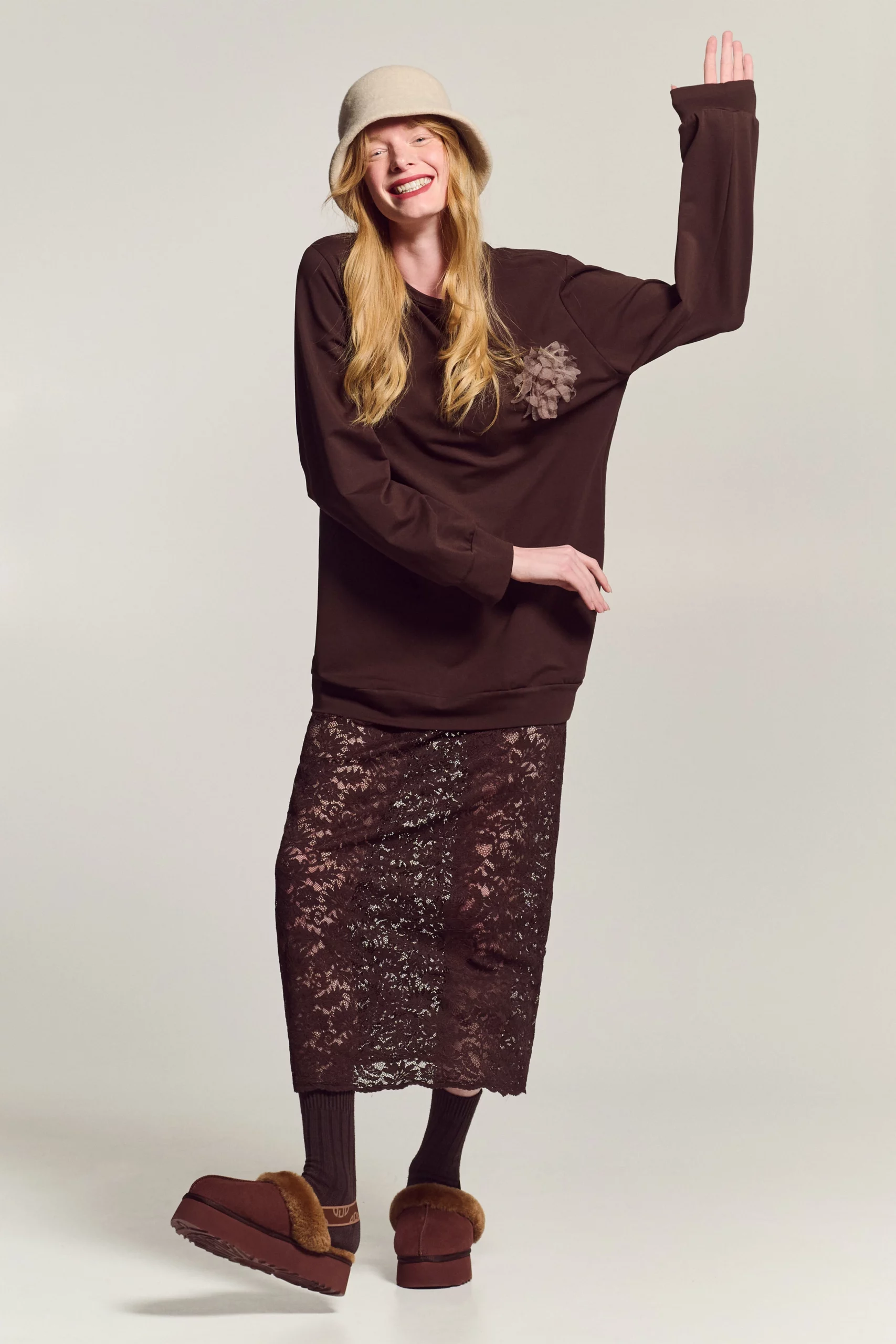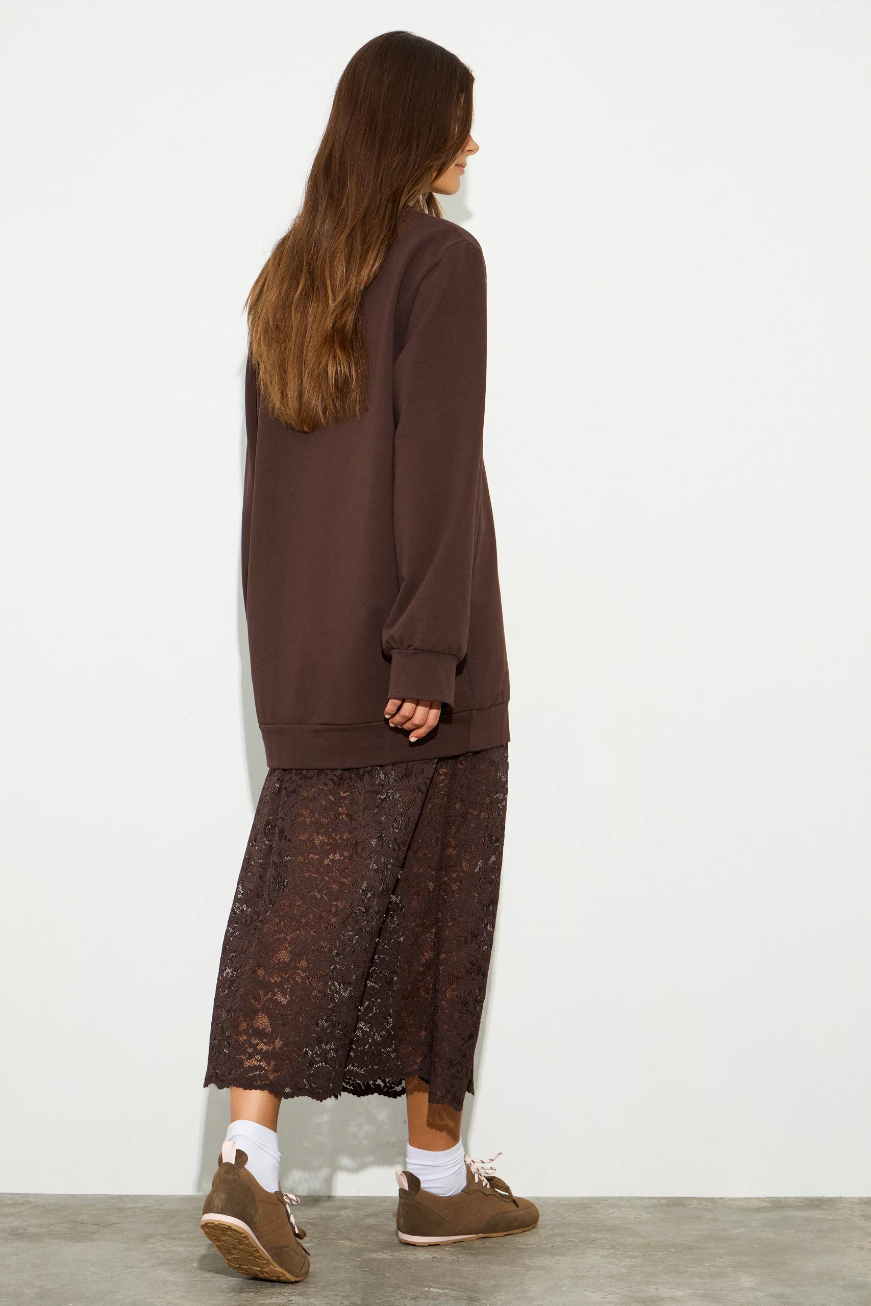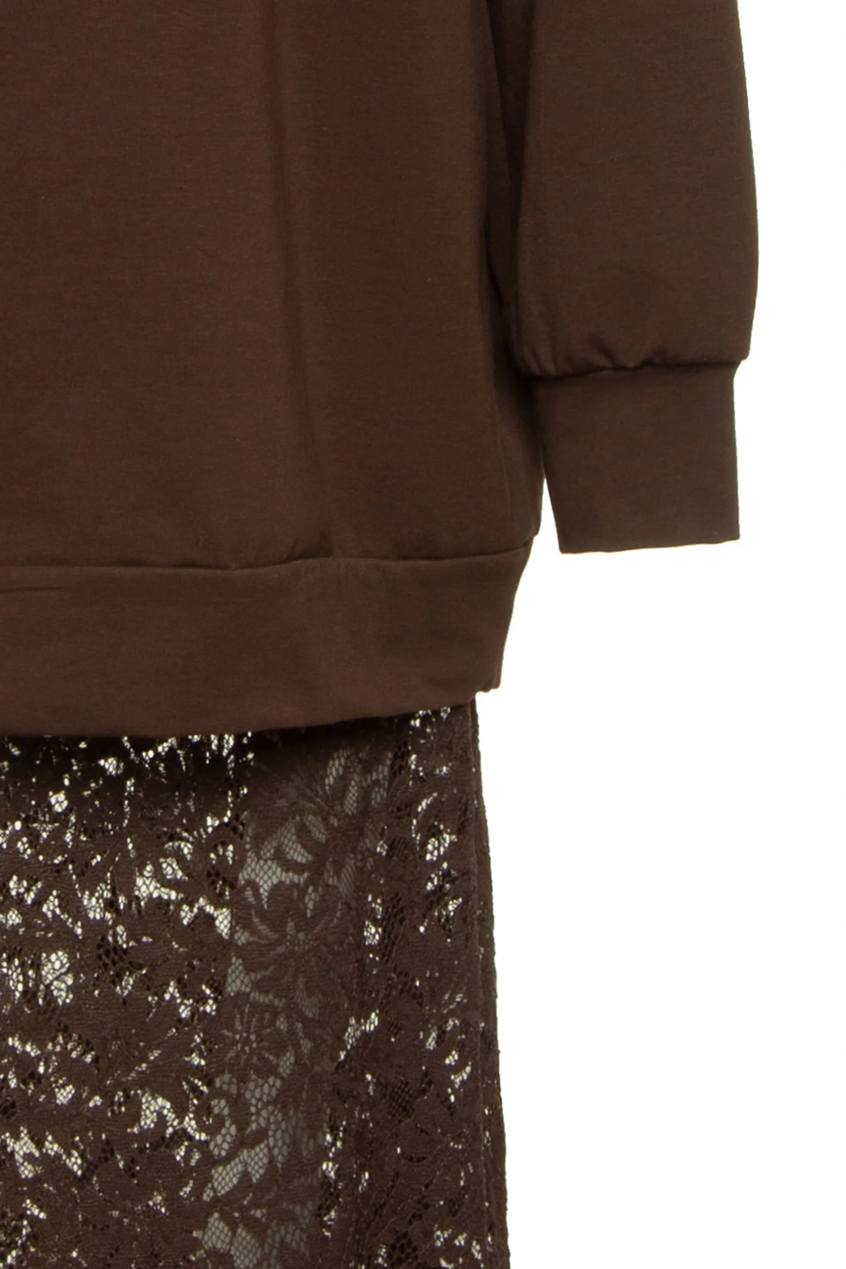 Vestido largo marrón, de manga larga, con escote redondo, estilo sudadera, con encaje, corte regular, de algodón.