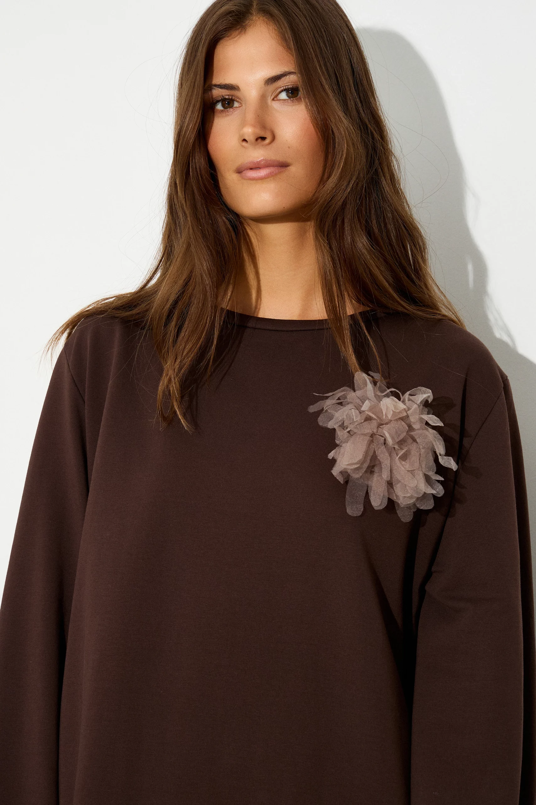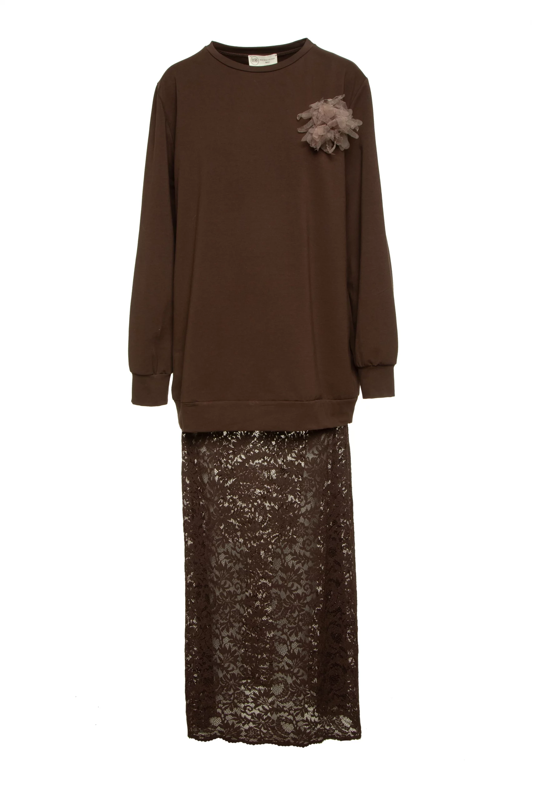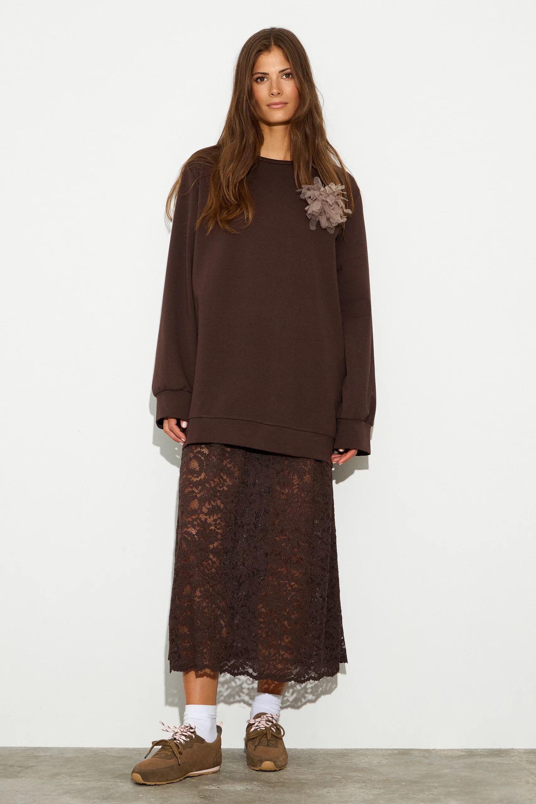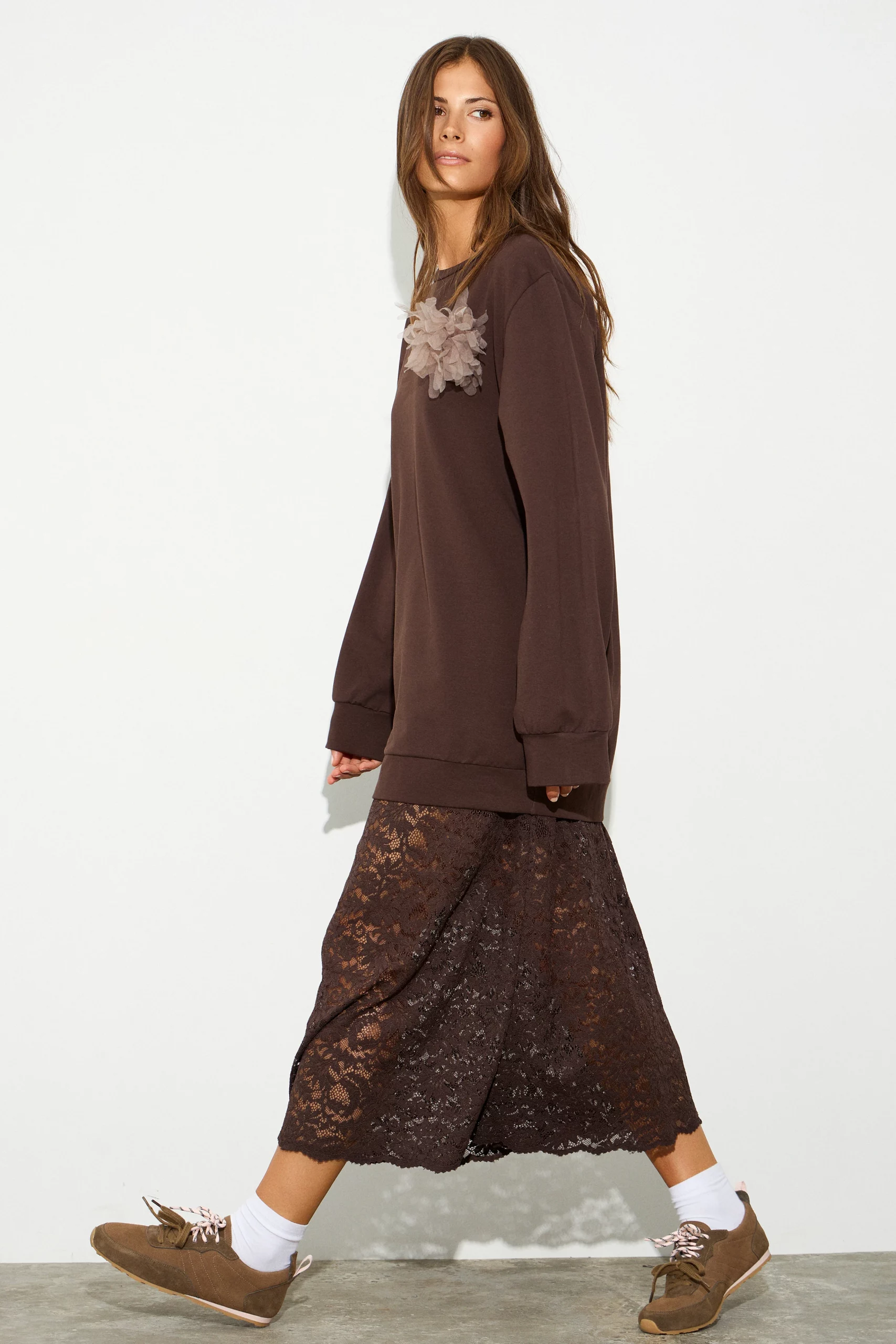 Vestido largo marrón, de manga larga, con escote redondo, estilo sudadera, con encaje, corte regular, de algodón.