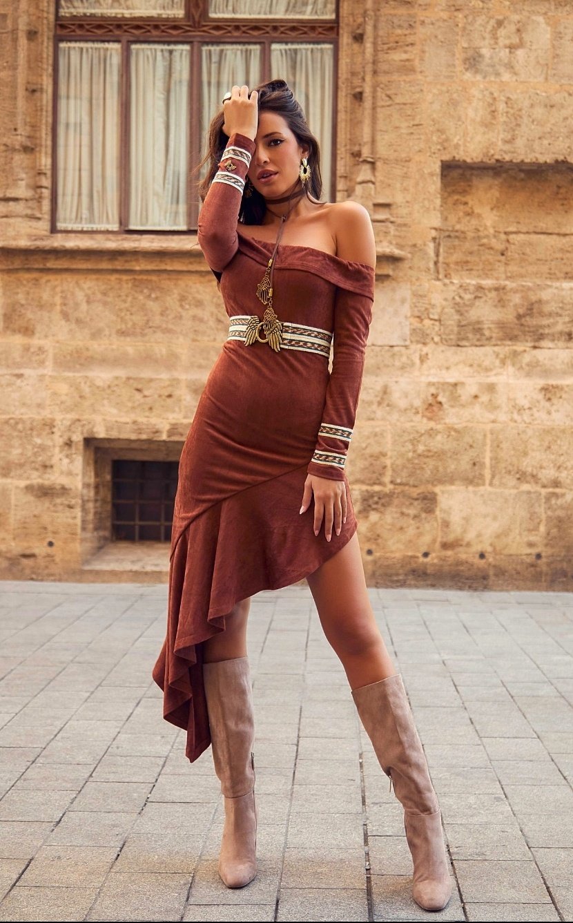 Vestido largo asimétrico de antelina color teja, manga larga, escote bardot. Volante asimétrico en el bajo y detalles de los puños. Cinturón con el mismo estampado del detalle de puños. Composición: 93% poliéster, 5% elastano.
