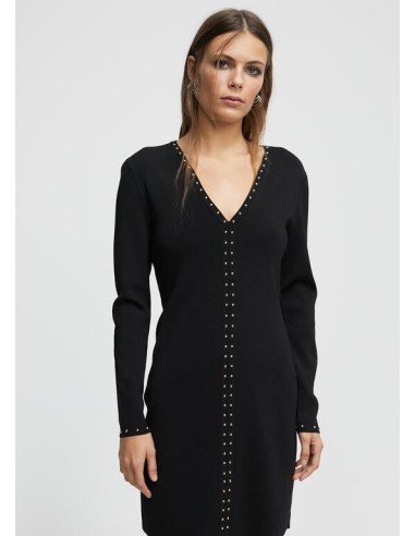 Vestido corto de punto con cuello pico. Detalle de tachas doradas en cuello, frontal y puños.