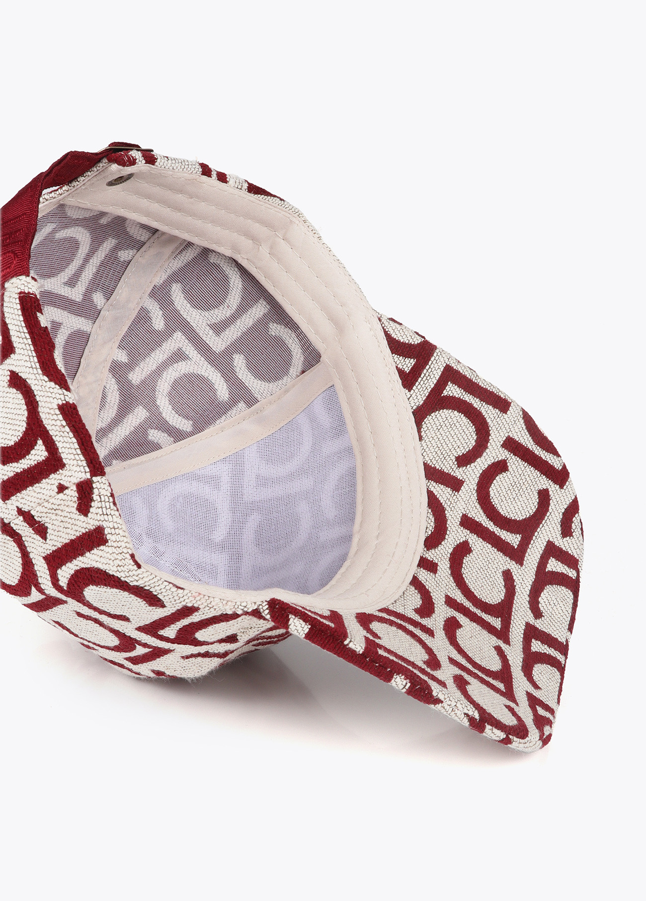 Visera elegante con estampado de logo en color burdeos. Diseño estructurado con cierre ajustable en la parte trasera. Perfecta para un look moderno y distintivo.